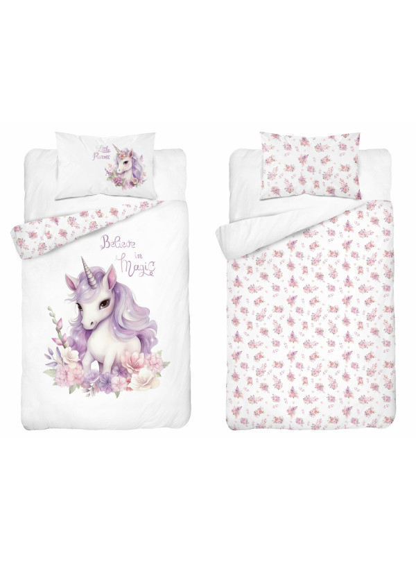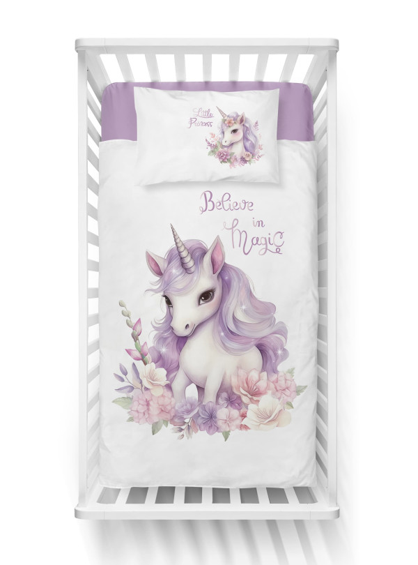 POŚCIEL DO ŁÓŻECZKA 100x135 FIOLETOWY JEDNOROŻEC KUCYK