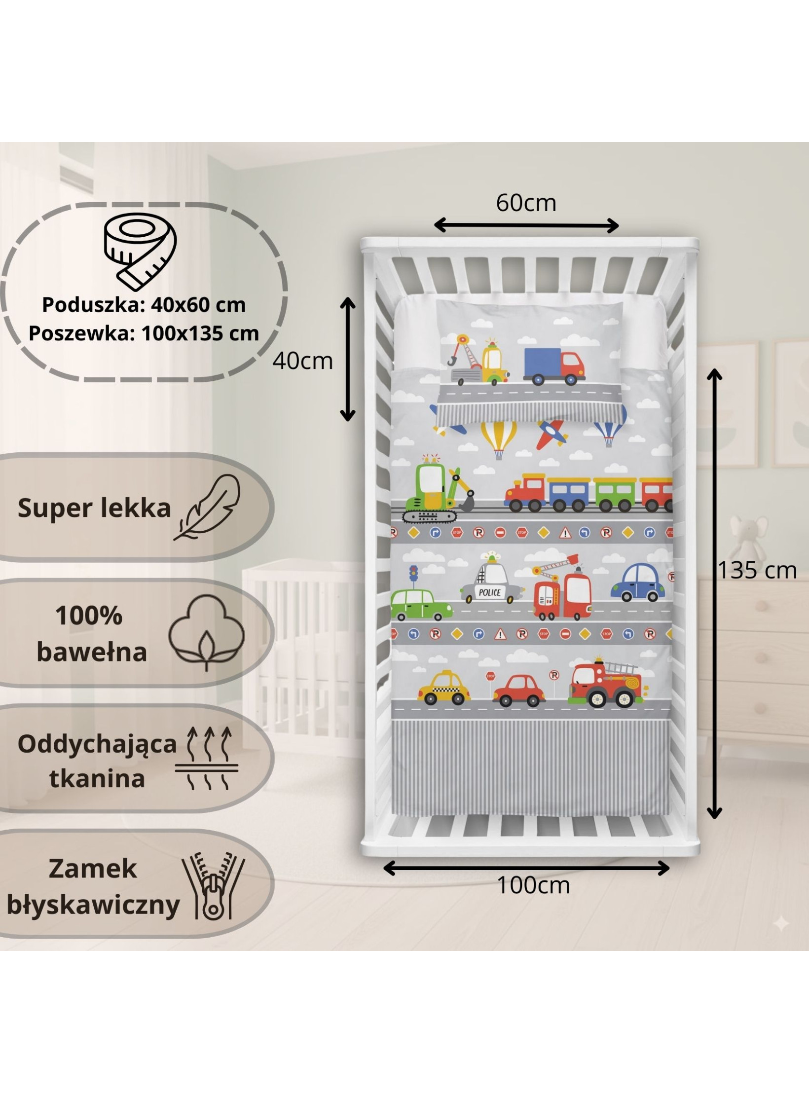 KOMPLET POŚCIELI DO ŁÓŻECZKA DZIECIĘCEGO 100X135 CM SZARA AUTA 5139_B