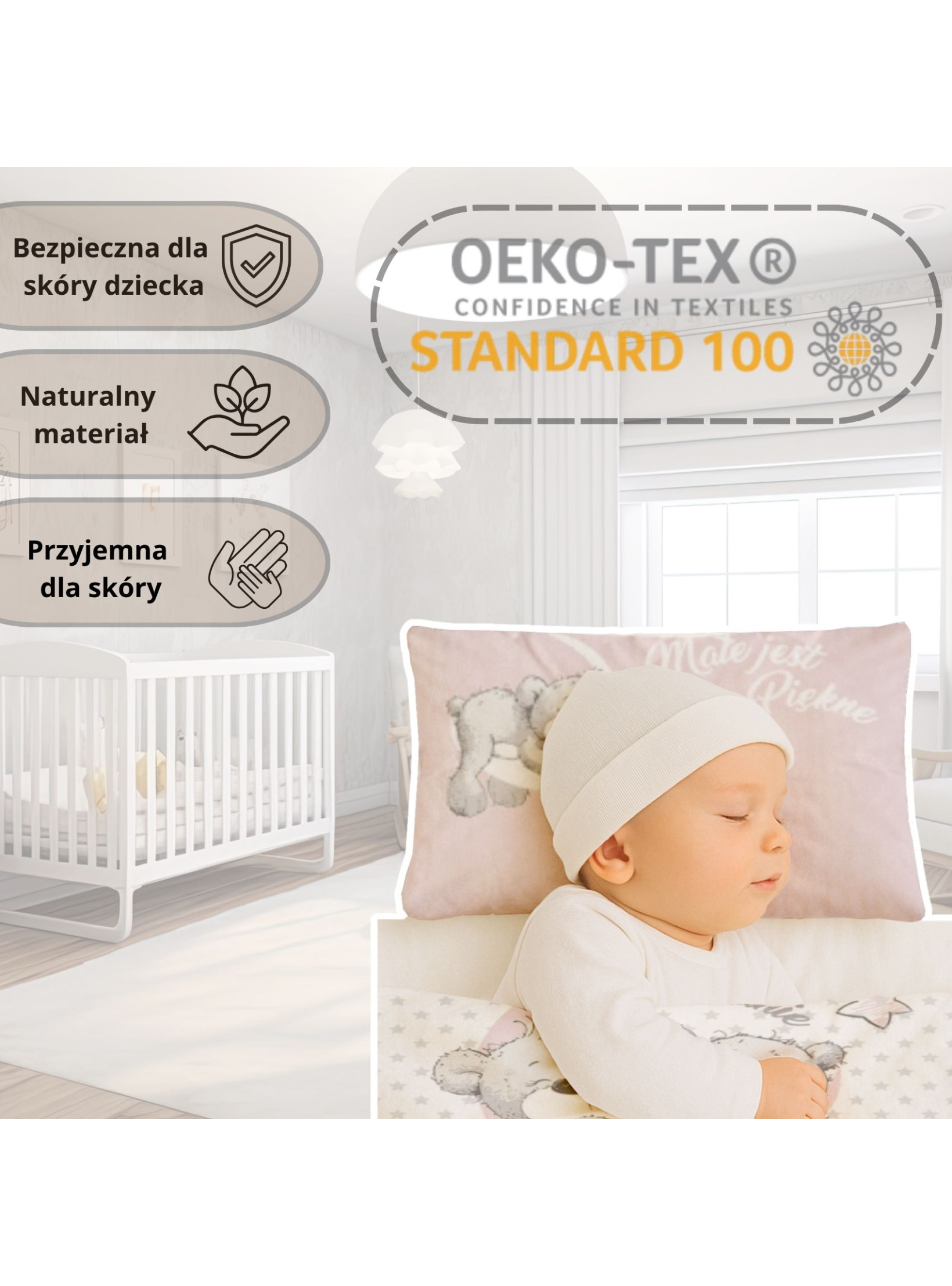 Każdy rodzic pragnie, aby jego maluszek spał spokojnie i bezpiecznie. Nasza pościel dziecięca 90x120 została uszyta z 100% bawełny, która jest miękka, oddychająca i w pełni naturalna. Certyfikat Oeko-Tex Standard 100 potwierdza, że tkanina jest wolna od szkodliwych substancji, dlatego to idealna pościel dla dziecka w jego pierwszych latach życia.