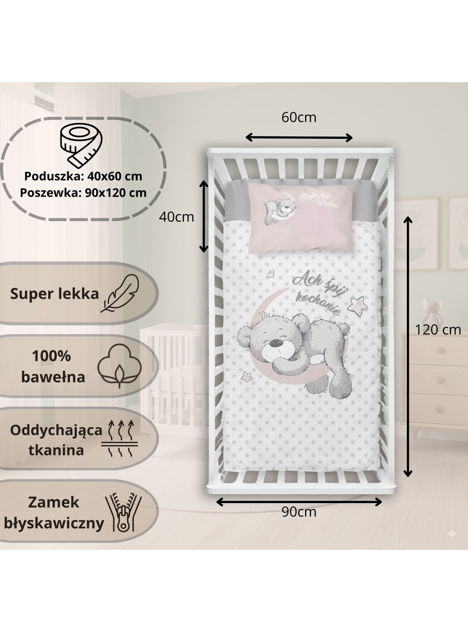 Wyobraź sobie, jak Twój maluszek zasypia otulony miękką pościelą w ulubione wzory. Słodki uśmiech, spokojny oddech i pewność, że śpi w mięciutkiej i wygodnej pościeli – to właśnie zapewnia nasz komplet pościeli bawełnianej do łóżeczka 90x120 cm. To nie tylko element wyposażenia, ale część codziennych, rodzinnych rytuałów – wieczornego przytulenia, bajki przed snem i spokojnej nocy.