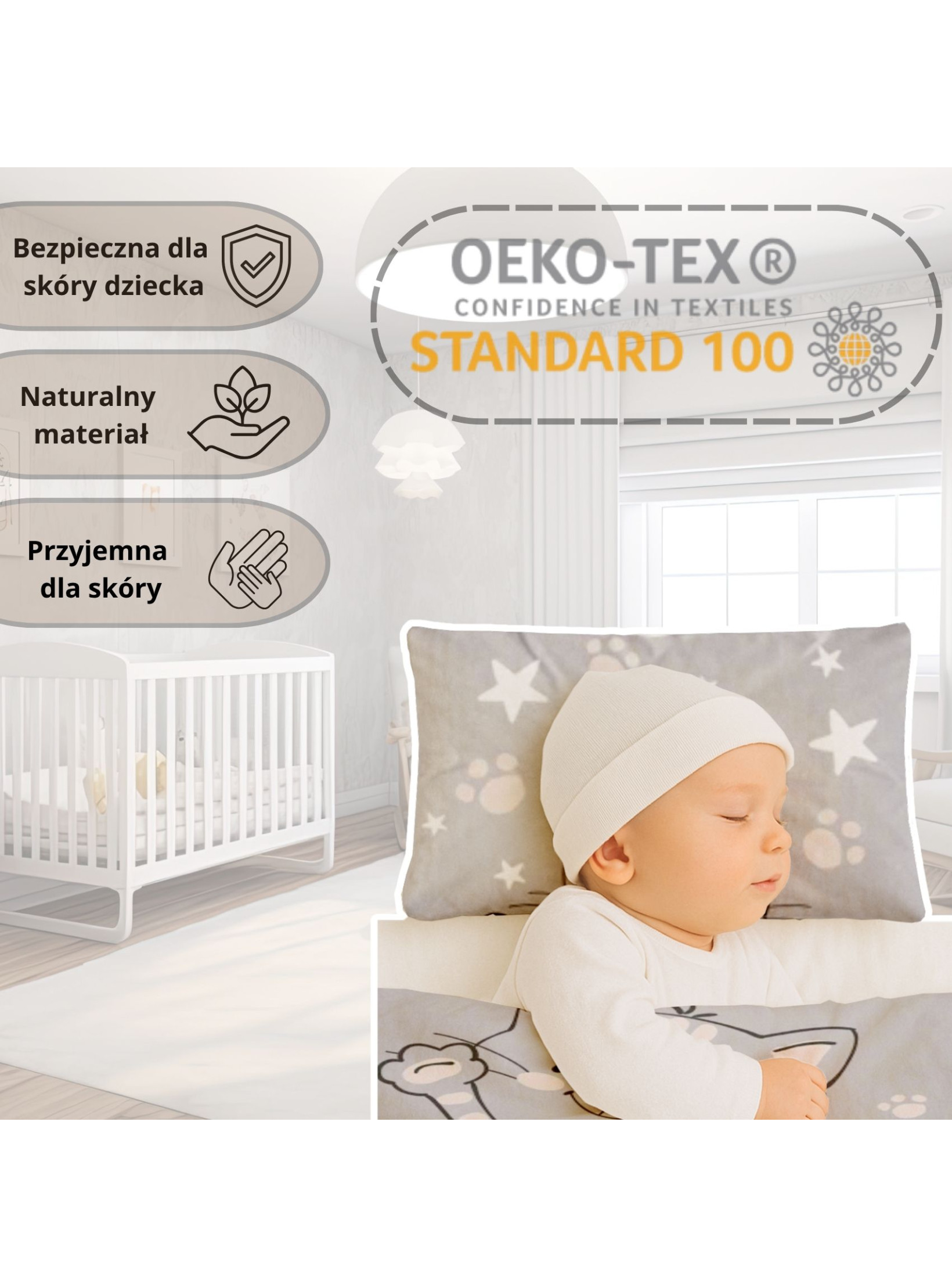 Każdy rodzic pragnie, aby jego maluszek spał spokojnie i bezpiecznie. Nasza pościel dziecięca 90x120 została uszyta z 100% bawełny, która jest miękka, oddychająca i w pełni naturalna. Certyfikat Oeko-Tex Standard 100 potwierdza, że tkanina jest wolna od szkodliwych substancji, dlatego to idealna pościel dla dziecka w jego pierwszych latach życia.