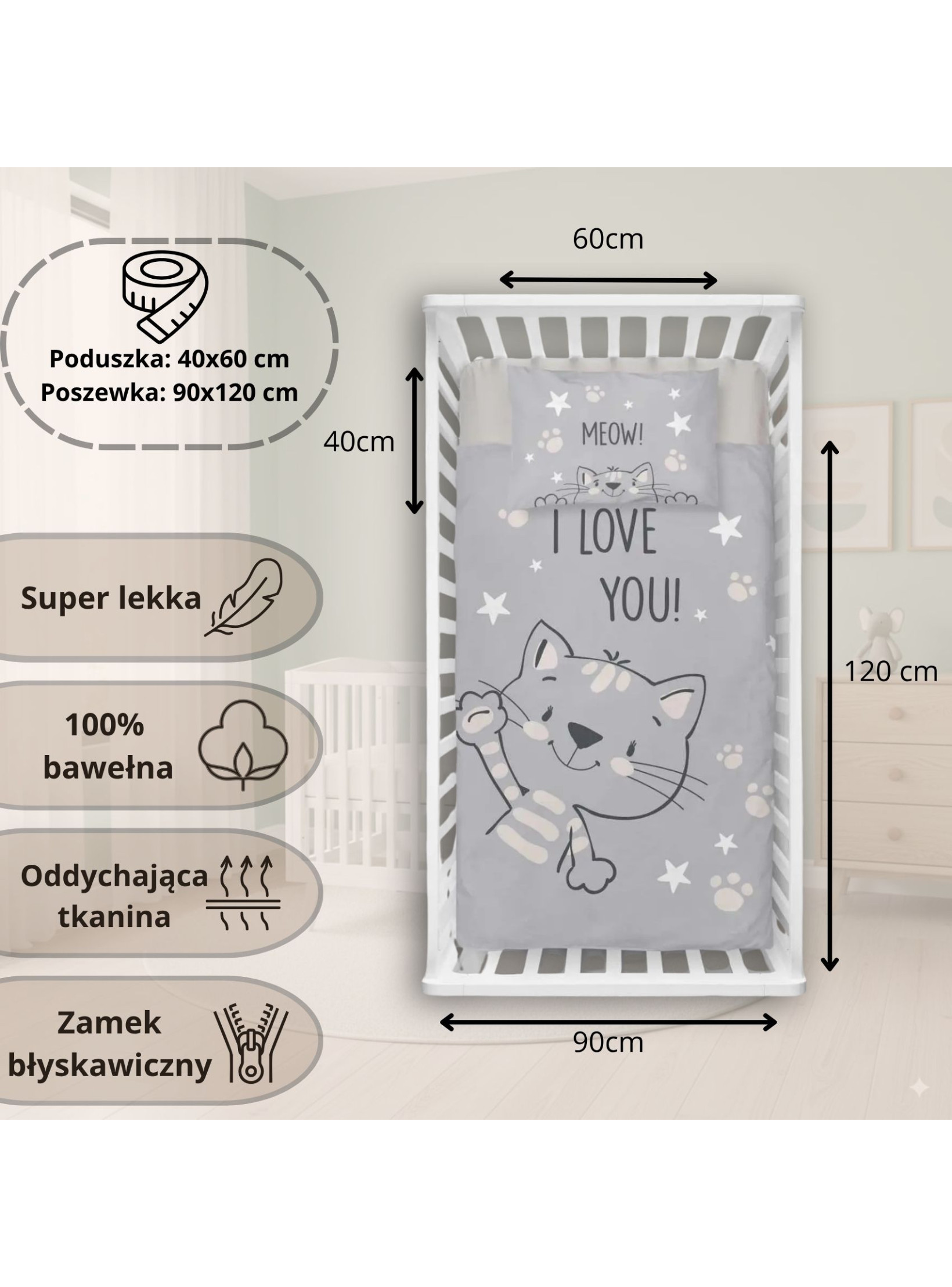 KOMPLET POŚCIELI DO ŁÓŻECZKA DZIECIĘCEGO 90x120 CM KOTEK SZARY 4992_B
