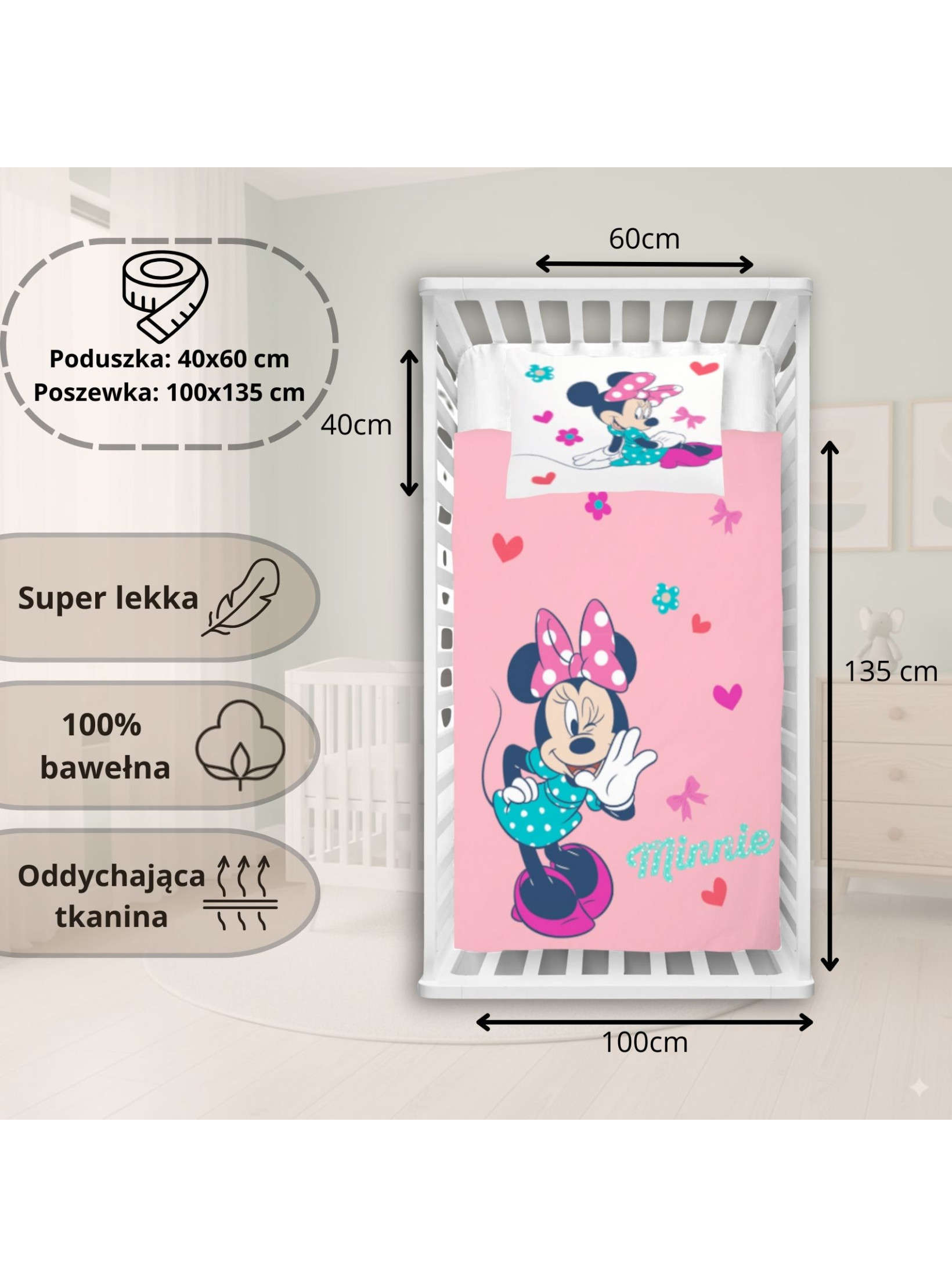 POŚCIEL DO ŁÓŻECZKA 100x135 cm MYSZKA MINNIE MN-52